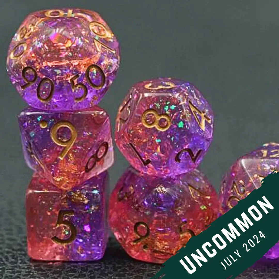 - Each 7 dice set includes: 1d20, 1d12, 1d10, 1d%, 1d8, 1d6, & 1d4