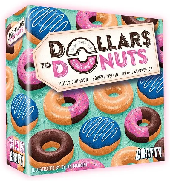 To end your turn, you can place a dollar tile on your shop board to complete a donut (and score) or fill a space with donut holes (which might also score). Additionally, you can serve a customer in line by offering them scoring tokens that match their desired donuts, which will earn you more points than the tokens on their own.