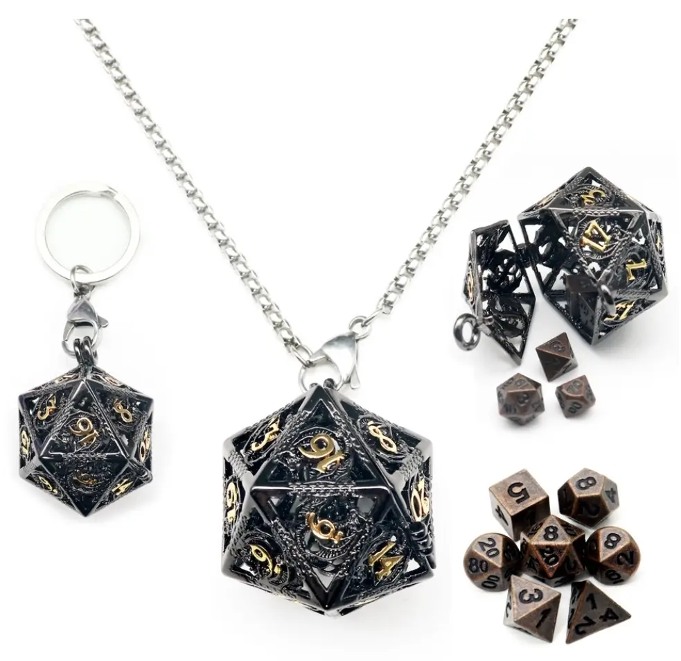 6mm Mini Metal DND Dice Set with Hollow D20 Dice Case and Necklace in an Antique Iron with Black Gold Cage
